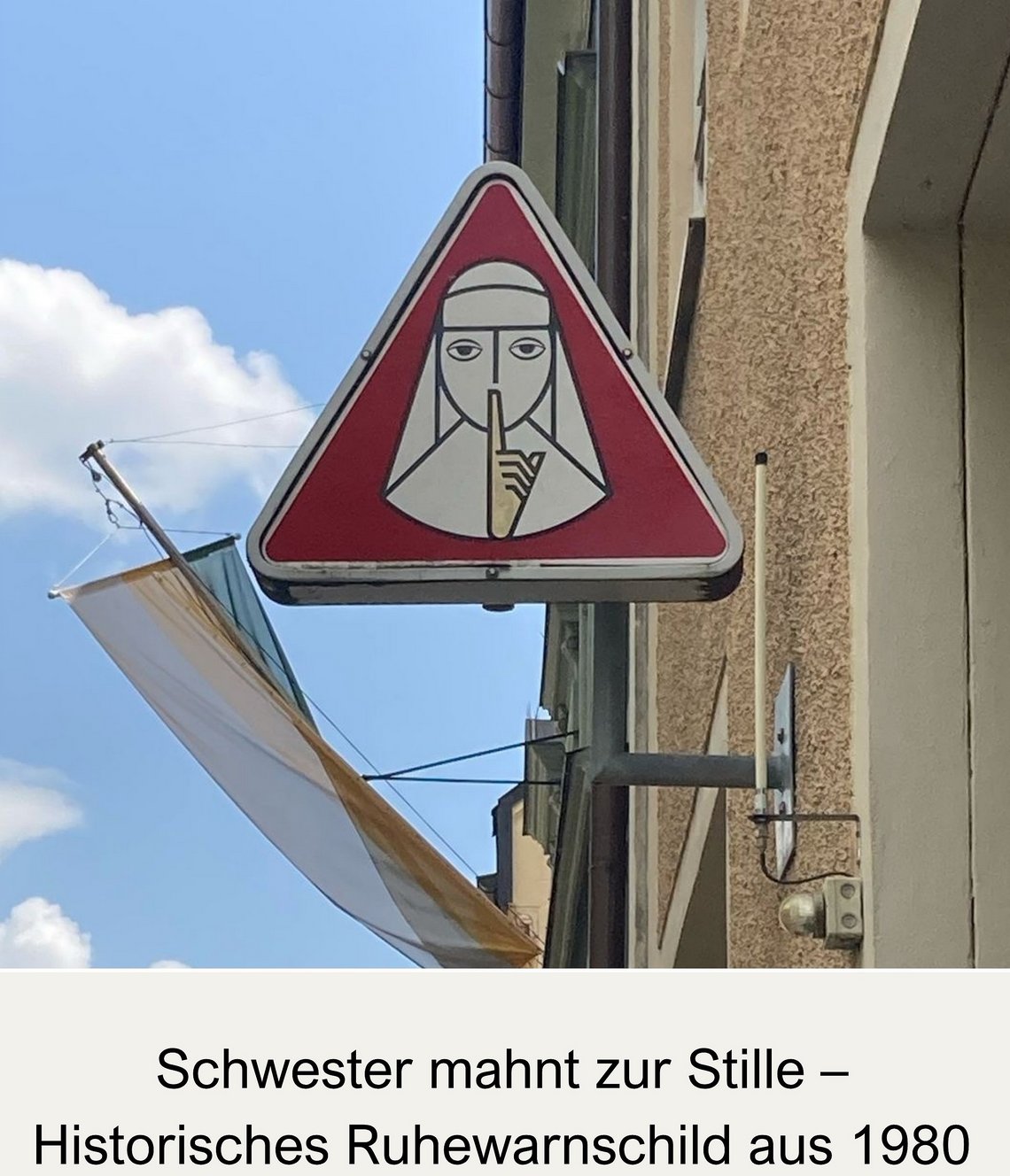Eben noch großer Trubel in Münchens Prachtboulevard, der Ludwigstraße, biege ich ein in die beschaulich ruhige Schönfeldstraße und werde gleich erst einmal von wahrscheinlich einem der ältesten Verkehrsschilder in der Stadt darauf hingewiesen, mich besonders ruhig zu verhalten.