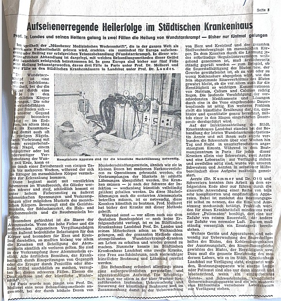 In den Jahren 1953 und 1954 gelang an den damaligen städtischen Krankenanstalten in Landshut ein medizinischer Erfolg, der weit über die Stadt hinaus Beachtung fand: Zwei Patienten überlebten Wundstarrkrampf (Tetanus) – eine Erkrankung, die damals fast immer tödlich verlief. In ganz Europa waren bis dahin nur drei Heilungsfälle bekannt. Mit den beiden Landshuter Fällen erhöhte sich die Zahl auf gerade einmal fünf. Das Medienecho war entsprechend groß: Von „aufsehenerregenden Heilerfolgen“ war die Rede, die nur durch einen „außergewöhnlichen personellen und apparatemäßigen Aufwand“ möglich geworden seien.