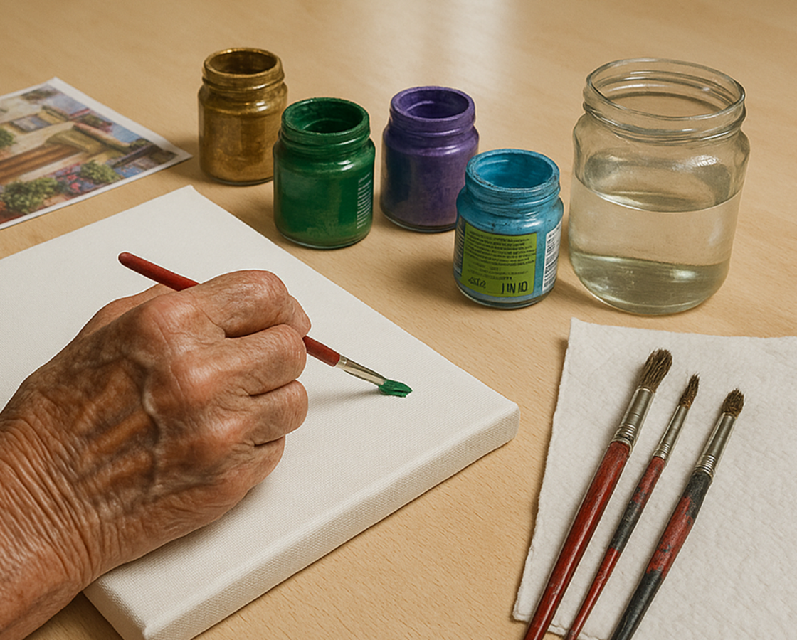 Diese Information war ein Schlüssel. Ich lud Frau M. zu unserem "Kreativen Angebot" ein – einem Gruppenangebot, das wir speziell für unsere Patienten mit kognitiven oder motorischen Einschränkungen anbieten. Die Ziele reichen von der Verbesserung der Feinmotorik über die Unterstützung bei der Planung von Handlungsabläufen bis hin zur psychischen Stabilisierung und der Schaffung von Erfolgserlebnissen. Wir arbeiten mit verschiedenen kreativen Werktechniken – angepasst an die Fähigkeiten und Bedürfnisse der Patienten. Da Frau M. von sich aus keine eigene Auswahl treffen konnte, habe ich ihr ein Bild mit Serviettentechnik angeboten. Dabei wird ein vorgefertigtes Serviettenmotiv auf einen Keilrahmen aufgebracht und mit Strukturpaste kreativ ergänzt. Wir sahen gemeinsam mehrere Motive durch, bis sie plötzlich auf ein Bild zeigte – eine mediterrane Landschaft, vielleicht aus der Toskana. Als ich die Serviette wie geplant aufkleben wollte, lehnte sie überraschend ab und deutete auf die Farben auf dem Tisch. Also reichte ich ihr Pinsel und Farben – und Frau M. begann das Serviettenmotiv auf den Keilrahmen zu zeichnen. Sie wurde in den Handlungen immer sicherer und ihre Gesichtszüge entspannten sich. Mit jedem Pinselstrich veränderte sich etwas: ihre Haltung, ihr Gesichtsausdruck, ihre Augen. Sie wirkte wacher, präsenter, als würde sie Stück für Stück zu sich selbst zurückfinden. Sie freute sich über die bewundernden Kommentare der Mitpatienten. Als sie das Bild fertiggestellt hatte, trug sie es mit großer Sorgfalt in ihr Zimmer. Dort wartete ihr Ehemann. Mit strahlenden Augen überreichte sie ihm das Gemälde. Er war sichtlich gerührt, fast sprachlos. Als er das Motiv näher betrachtete kamen ihm die Tränen: das Motiv erinnerte ihn an ihre Hochzeitsreise. In dem Blick, den sich beide dann zuwarfen spürte ich das Glück, die Verbundenheit und die Liebe die die beiden miteinander verbindet. Trotz aller Krankheit, trotz allem Vergessens blieb etwas, das sie verband – eine gemeinsame Erinnerung, ein Gefühl, das nicht verging. Dieser Moment hat mich tief berührt.