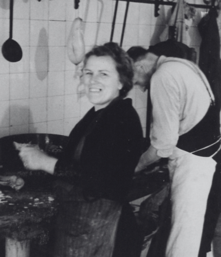 Dr. Fritz Erler bei der Arbeit (im Hintergrund): Das Schnipseln für den Pressack war seine Lieblingsbeschäftigung