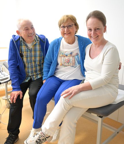 Oberärztin Dr. Katharina Heller (r.) hat schon viele Lebendspendepaare aufgeklärt und begleitet. Mit Josef und Eva Zach entstand spontan dieser besondere Schnappschuss. Foto: Franziska Männel/Uniklinikum Erlangen